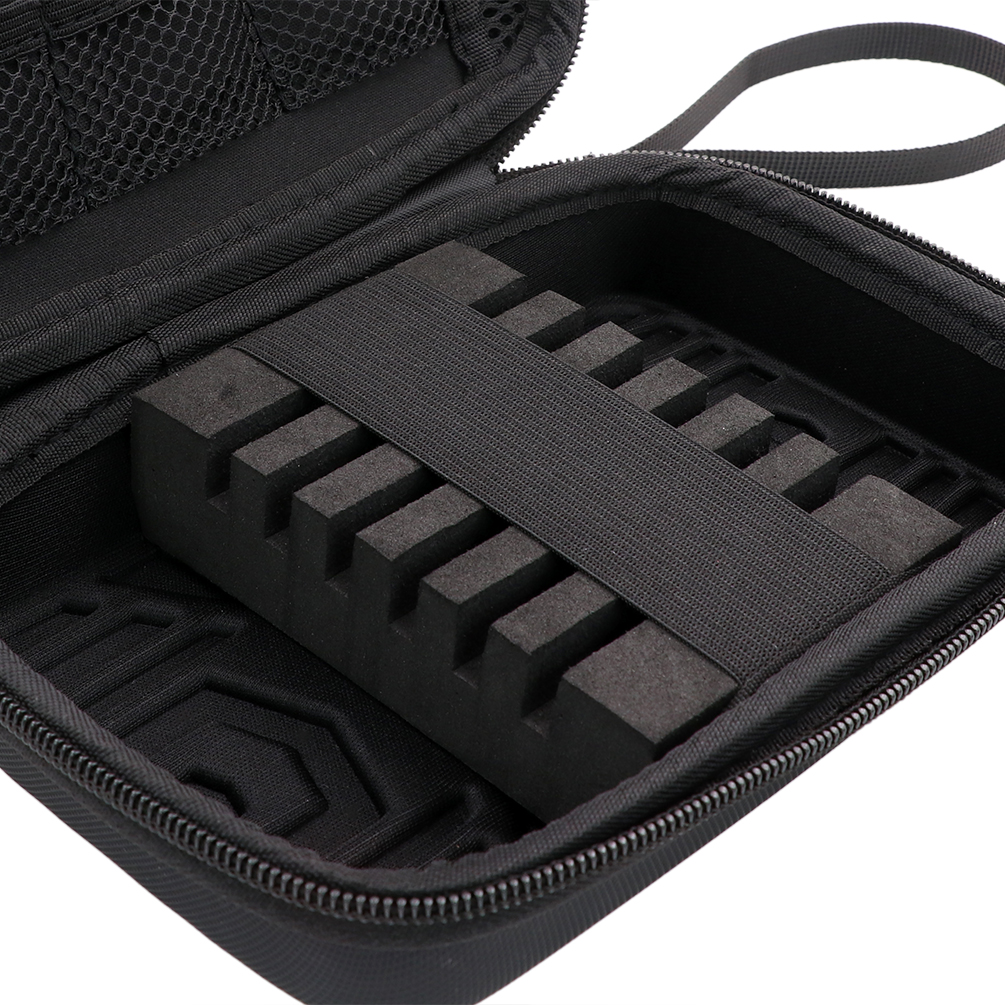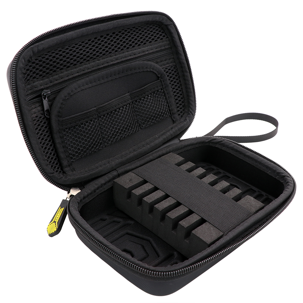 Kotelon kova EVA-kuori tarjoaa erinomaisen pidon, rakenne pysyy jäykkänä ja suojaa tikat ja tarvikkeet iskuilta ja kolhuilta. Sisäpuolella on samettipintainen kerros sekä kolme taskua taitettaville sulille, jotka suojaavat naarmuilta.